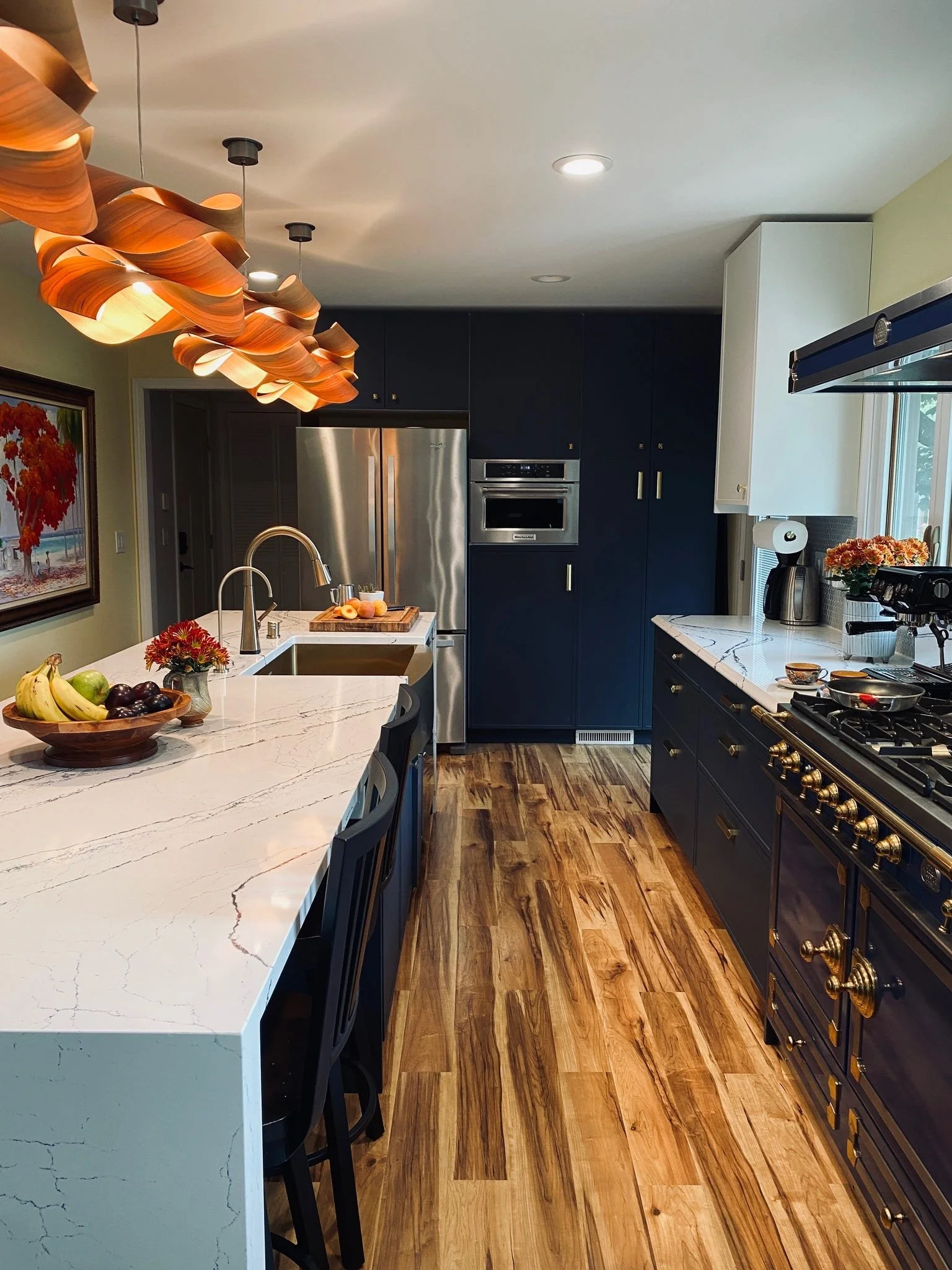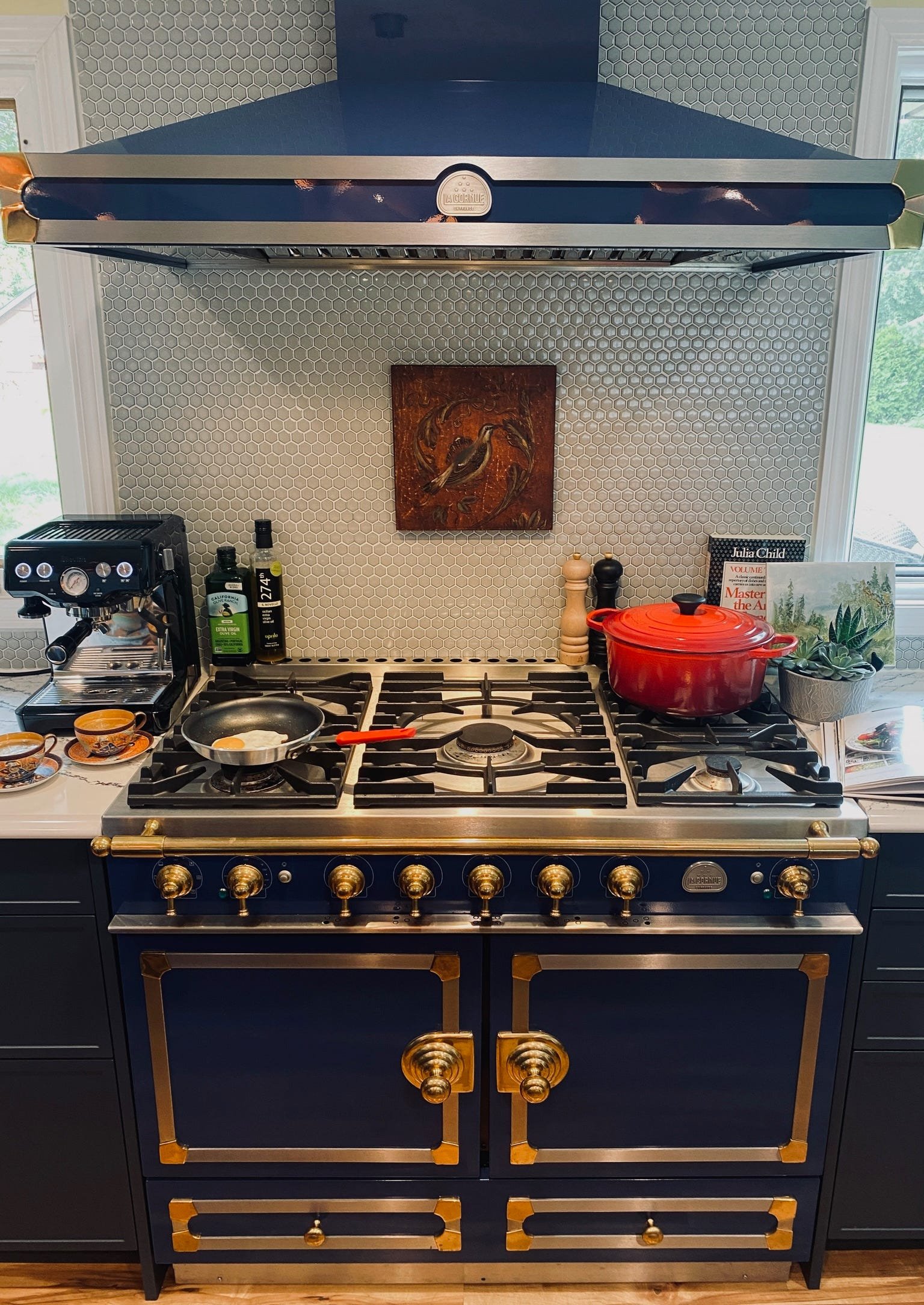 The La Cornue range in my kitchen is a perfect example. It’s a design win on its own. The space doesn’t need anything else shouting for attention. So the lighting is simpler, and the hardware matches without competing.